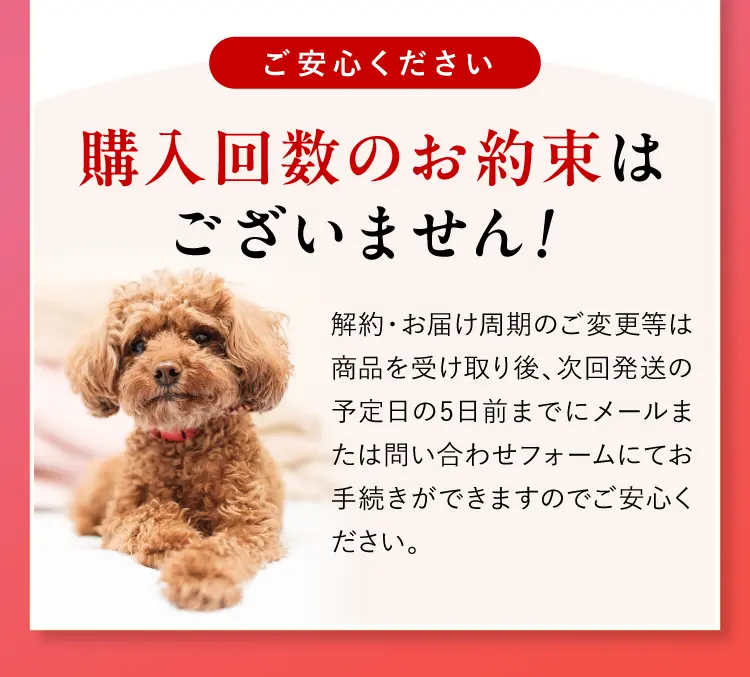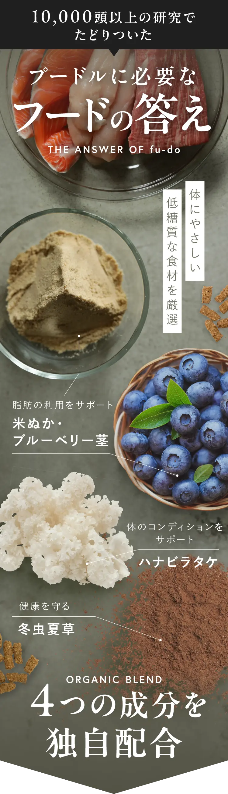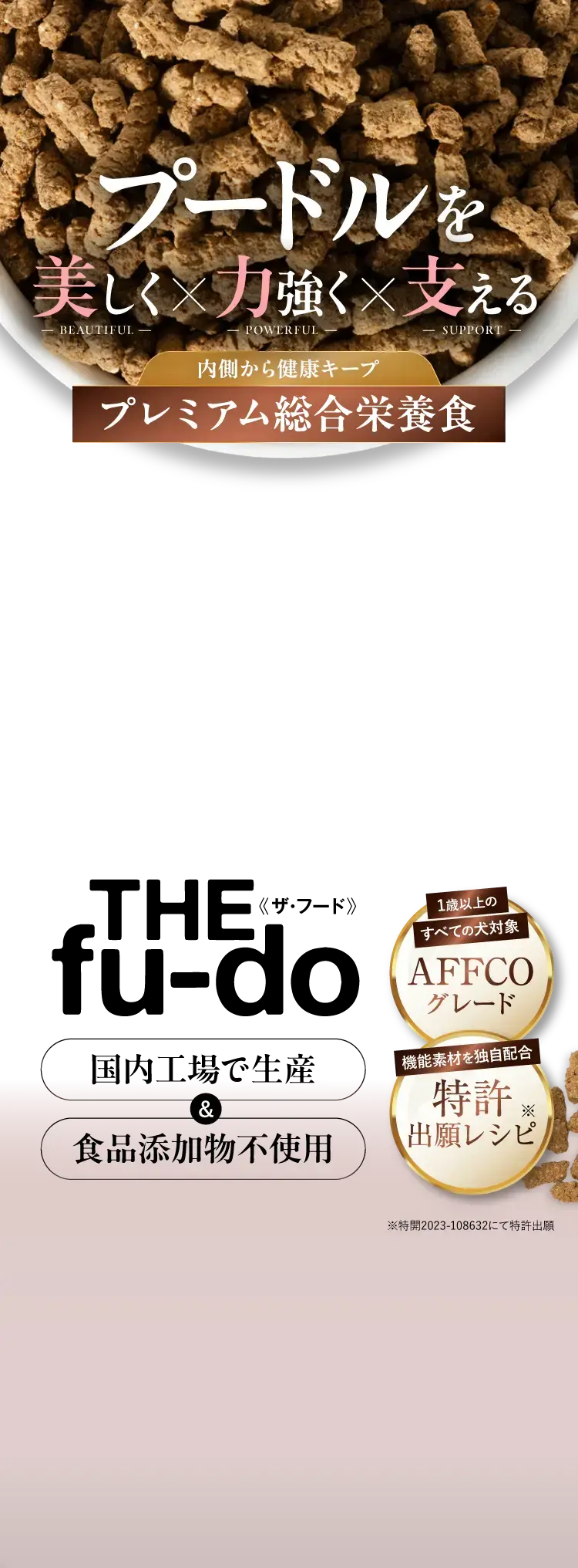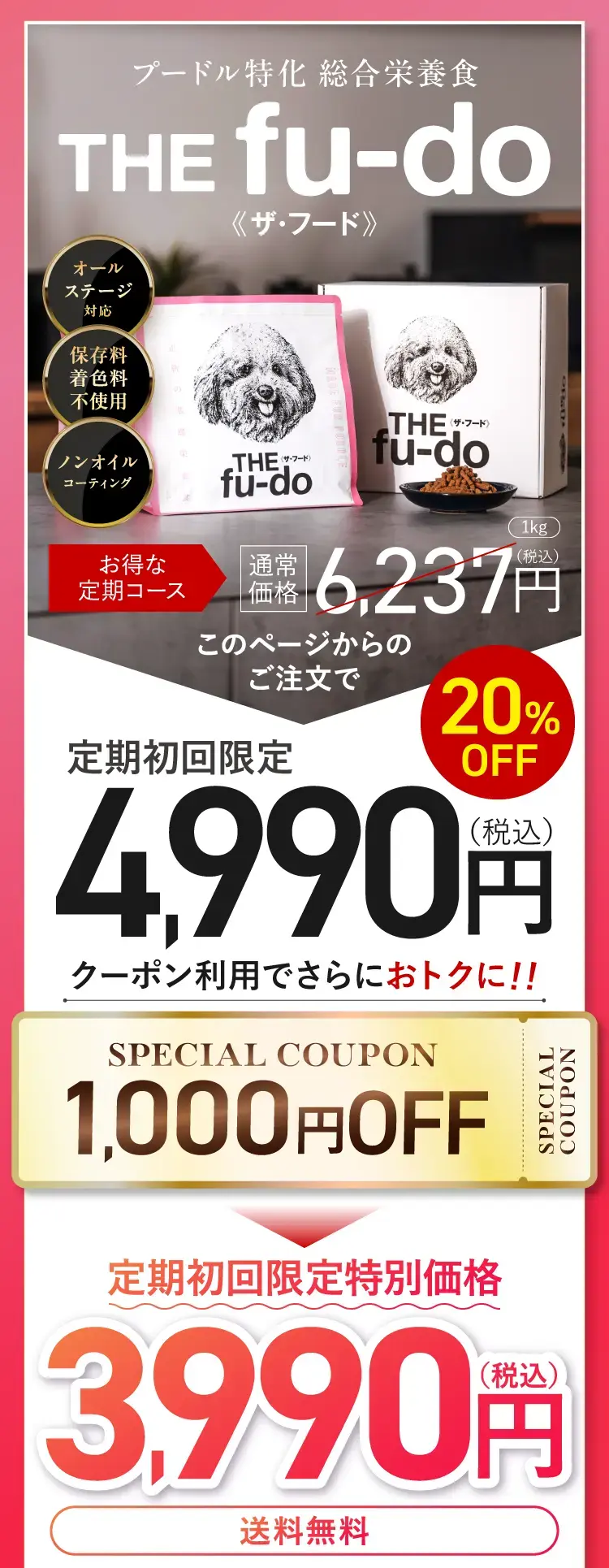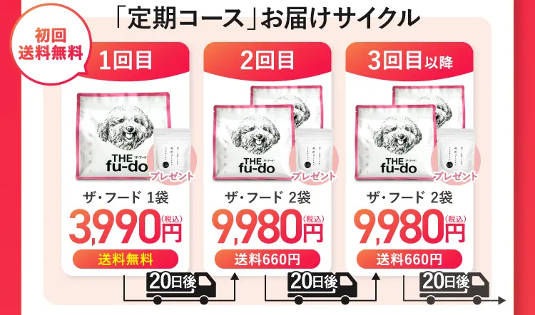 ●本コースはTHE fu-do(ザ・フード) for プードルをお届けするお得な定期コースです。●定期コースの契約は解約連絡まで自動更新となります。●初回3,990円(税込/+送料無料)、2回目以降は9,980円(税込)+送料660円(税込)、計10,640円(税込)となります。●2回目以降は1袋(内容量:1kg)あたり約20%OFFの4,990円(税込)で2袋ずつ(1袋あたり1kgの計2kg)、別途送料660円(税込)でお届けします。合計金額は10,640円(税込)です。●後払い選択時は別途手数料220円が発生します。●引渡時期は初回は11月15日前後。2回目以降は20日毎に2袋ずつお届けいたします。●お支払い時期は、初回・2回目以降ともにクレジットカード:決済確認後発送、コンビニ払い:商品到着後10日以内です。●解約・お届け周期のご変更などご希望のお客様は商品をお受け取り後、次回発送予定日の5日前までにメール(support@the-dot.life)またはマイページにてご変更ください。●返品は、商品未開封の状態で8日以内にメール(同上)までご連絡ください。●返品送料はお客様ご負担になり、事前にご連絡のない場合返品をお受けできません。●返品につきまして、詳しくは利用規約をご確認ください。